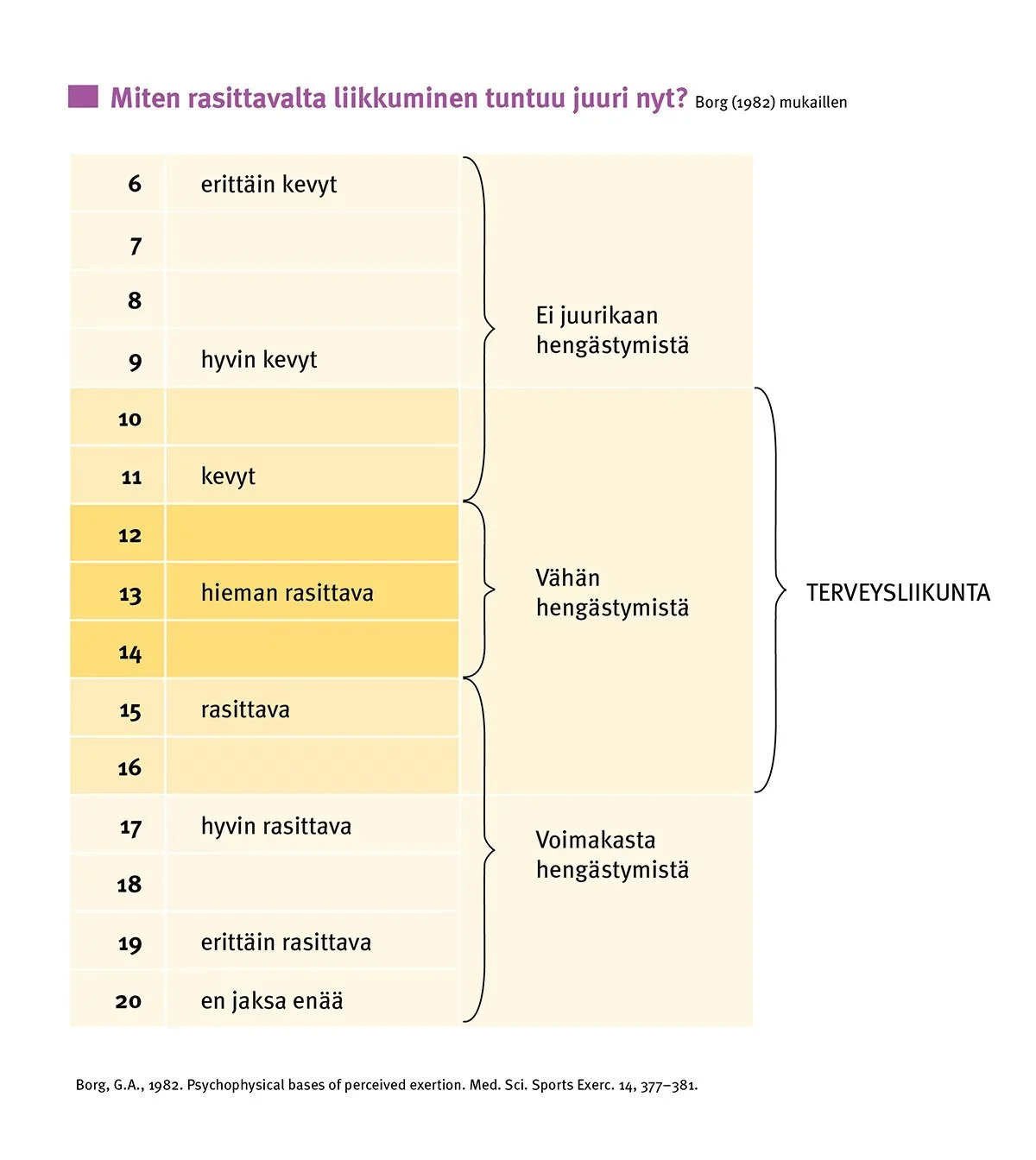 Onko prosenttia (%) maksimaalisesta hapenottokyvystä sitten sama asia kuin prosenttia (%) maksimisykkeestä? Ei ole, mutta harjoitustehon mittaaminen sykkeen avulla perustuu tutkimuksissa todettuun lineaariseen suhteeseen hapenkulutuksen ja sykkeen nousun välillä. Sykemittari on myös helppo ja käytännöllinen apuväline liikkujalle. Sykkeen mittaamiseen harjoitustehon määrittäjänä liittyy kuitenkin rajoitteita. Toisin kuin hapenkulutukseen, sykkeeseen vaikuttavat monet asiat (stressi, sairaudet, ylikunto, monet lääkkeet, harjoituksen ajankohta, kofeiinin nauttiminen, tupakointi, ravitsemustila, nesteytystila, kehon lämpötila sekä harjoituspaikan lämpötila). Näistä tekijöistä johtuen saman harjoituksen aikainen syke voi vaihdella päivien välillä.Intervalliharjoittelussa ongelmaksi muodostuu myös fakta, että lyhyiden työosuuksien aikana ei käytännössä useinkaan ehditä saavuttaa teoriassa määriteltyä tavoiteltua sykettä. Sykkeen tukena tai pelkästäänkin voidaan käyttää subjektiivista arviota harjoituksen tehosta. Kuvassa 1 esitetään Borgin asteikko, joka on yksinkertainen, mutta yllättävän luotettava apuväline harjoitustehon mittaamiseen. HII-treeneissä tavoitellaan useimmiten rasitustasoa 18–20. Muitakin tapoja, kuten anaerobisella kynnyksellä tehdyt työjaksot, voidaan hyvin käyttää tehon määrittämisessä, jos kuntoilija tuntee omat kynnyksensä.